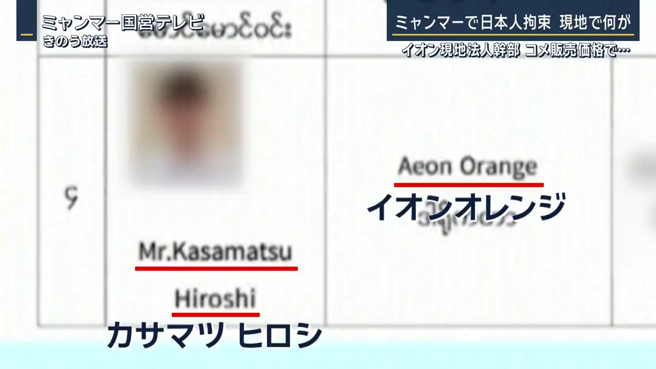 「「イオンオレンジ」で商品本部長を務める日本人が、当局に拘束されたとミャンマーの国営テレビが報じる