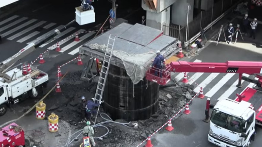 「地下にあった直径5mほどの下水道に関わる設備(円柱様のもの)が何らかの理由で18メートルほど地上にせり上がっているということです。」
